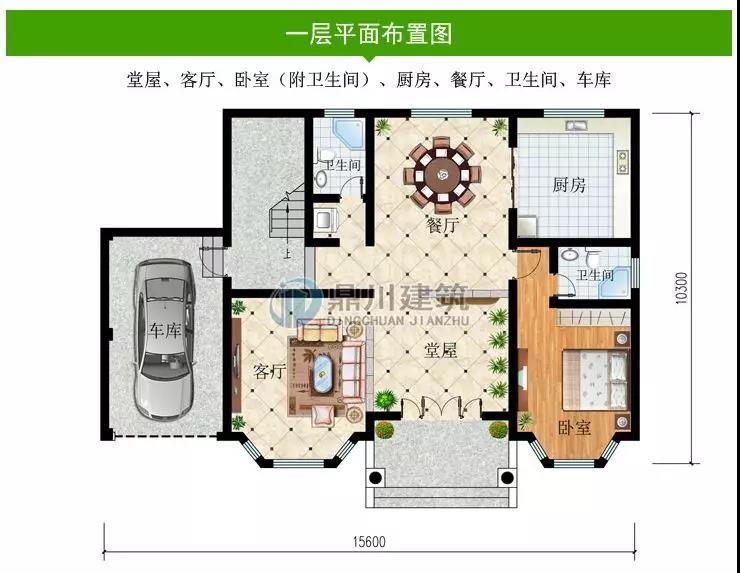 一 層:入口玄關(guān)、客廳、餐廳、廚房、客房、衛(wèi)生間、車庫