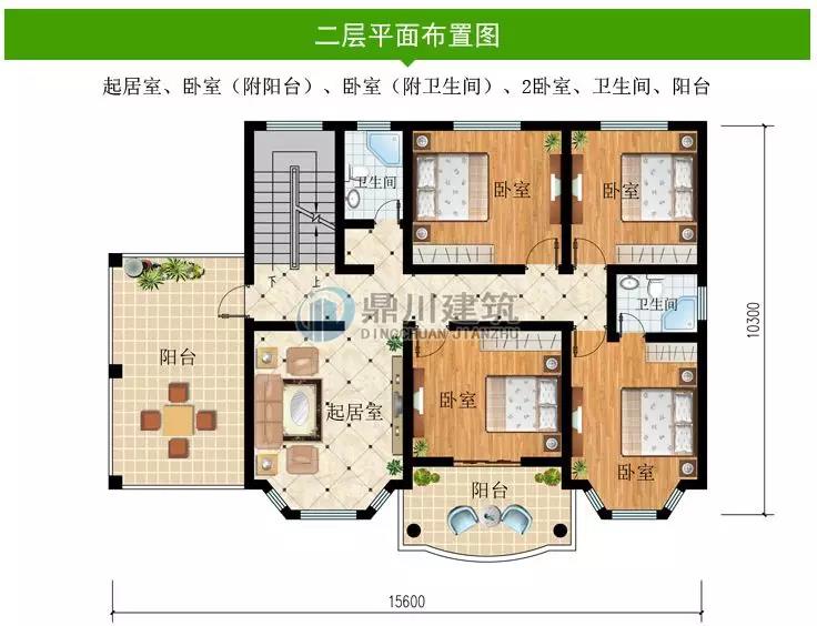 二 層:起居室、臥室(附書房,衛(wèi)生間,陽臺(tái))、臥室、棋牌室、衛(wèi)生間