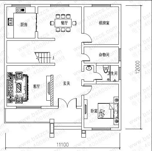 一 層: 客廳、臥室、棋牌室(或臥室)、廚房、餐廳、雜物間、衛生間