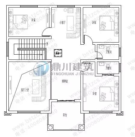 二 層: 小客廳、臥室(附衛生間)、2臥室、書房(或臥室)、衛生間、陽臺