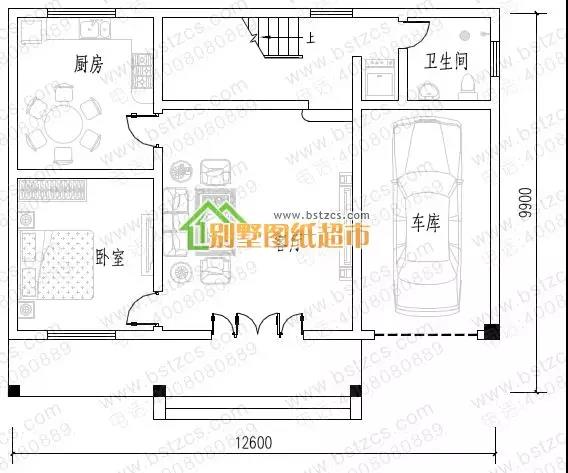 一 層: 客廳、臥室、廚房(兼餐廳)、衛生間、車庫
