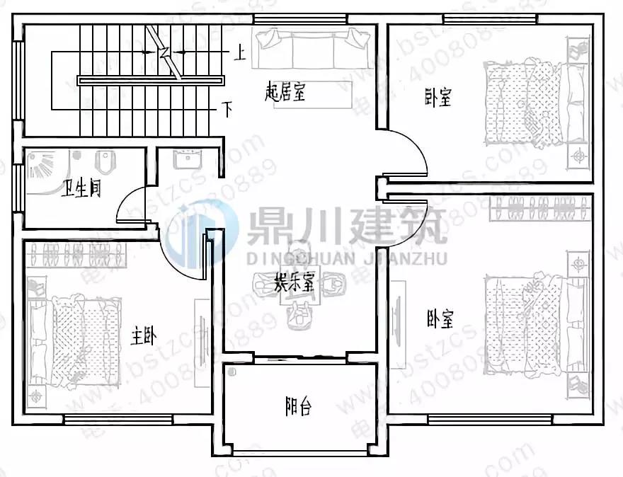 二 層:起居室、娛樂(lè)室(附陽(yáng)臺(tái))、3臥室、衛(wèi)生間