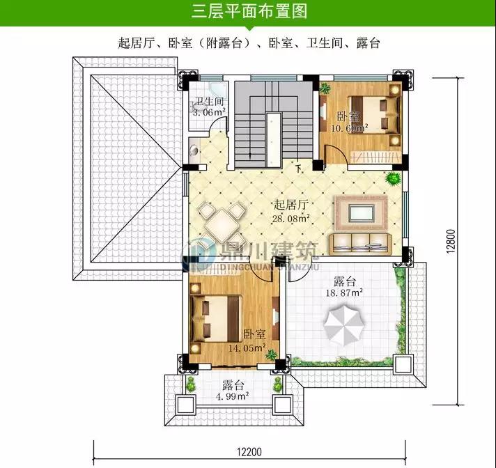 ■三層設(shè)有三間臥室和起居室,并帶有大露臺(tái),便于農(nóng)村休閑和娛樂(lè)。
