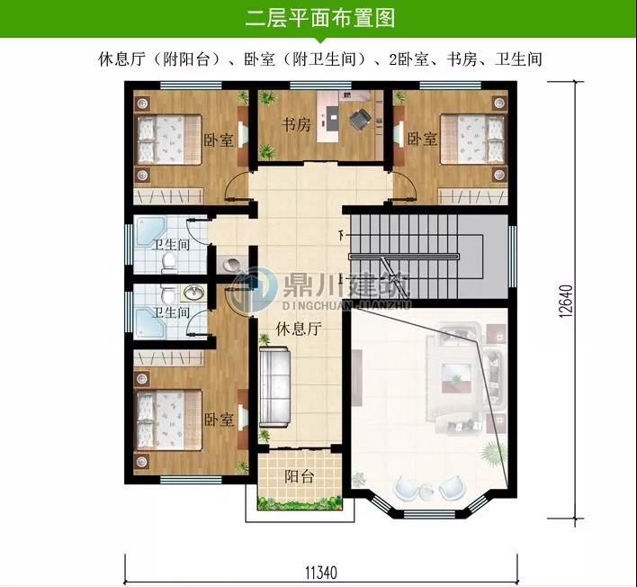 二 層: 休息區(qū)(附陽(yáng)臺(tái))、臥室(附衛(wèi)生間)、2臥室、書(shū)房、衛(wèi)生間