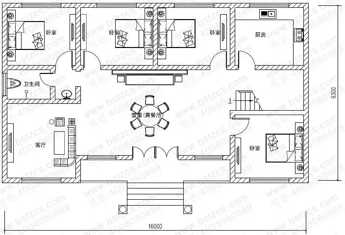 一 層: 堂屋(兼餐廳)、客廳、4臥室、廚房、衛(wèi)生間