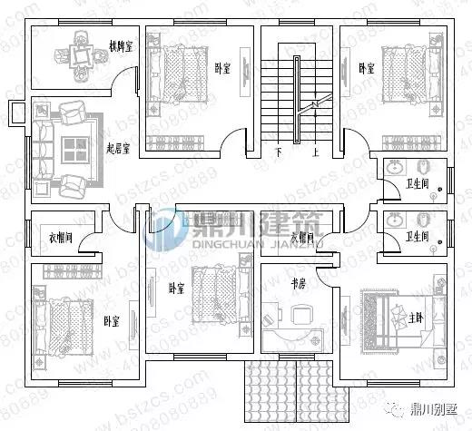 二 層:起居室、棋牌室、臥室(附書房,衣帽間,衛(wèi)生間)、臥室(附衣帽間)、3臥室、衛(wèi)生間