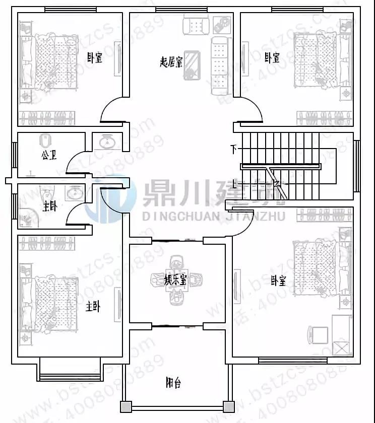 二 層:起居室、娛樂室(附陽臺)、臥室(附衛生間)、3臥室、衛生間