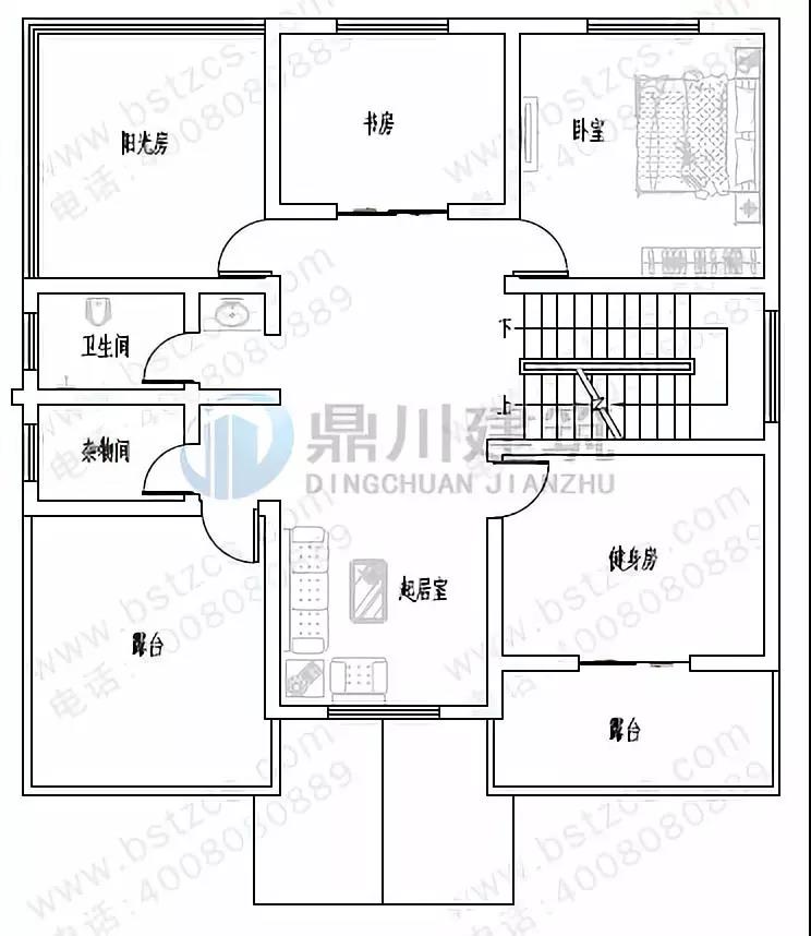 三 層:起居室、臥室、書房、陽光房、健身房(附露臺)、衛生間、雜物間、露臺