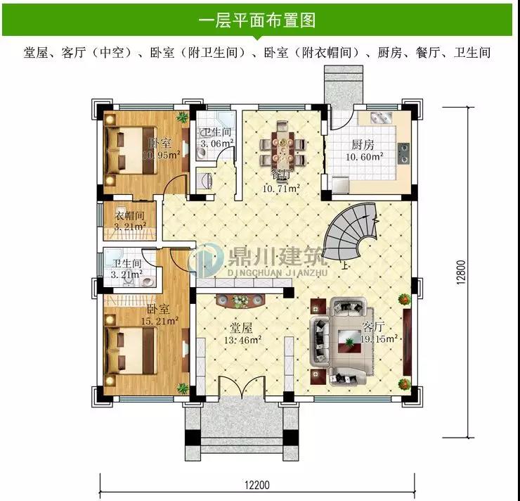 一 層:堂屋、客廳(中空)、臥室(附衛生間)、臥室(附衣帽間)、廚房、餐廳、衛生間