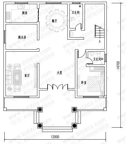 一 層:大堂、客廳、臥室(附衛生間)、娛樂房、廚房、餐廳、衛生間;