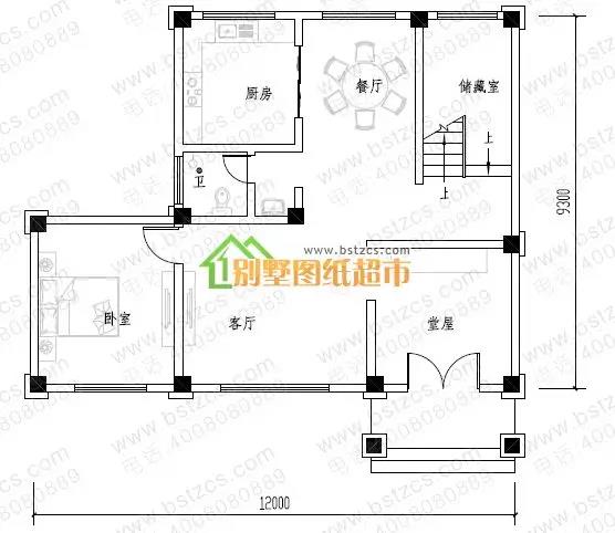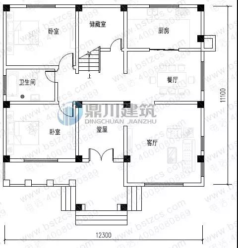 一 層:走廊、堂屋、客廳、2臥室、廚房、餐廳、衛生間、儲藏室