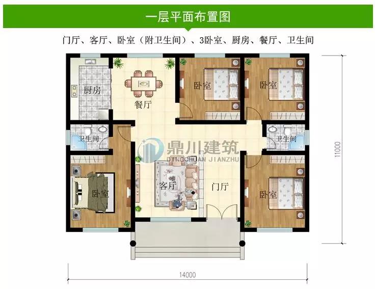 一 層:門廳、客廳、臥室(附衛生間)、3臥室、廚房、餐廳、衛生間