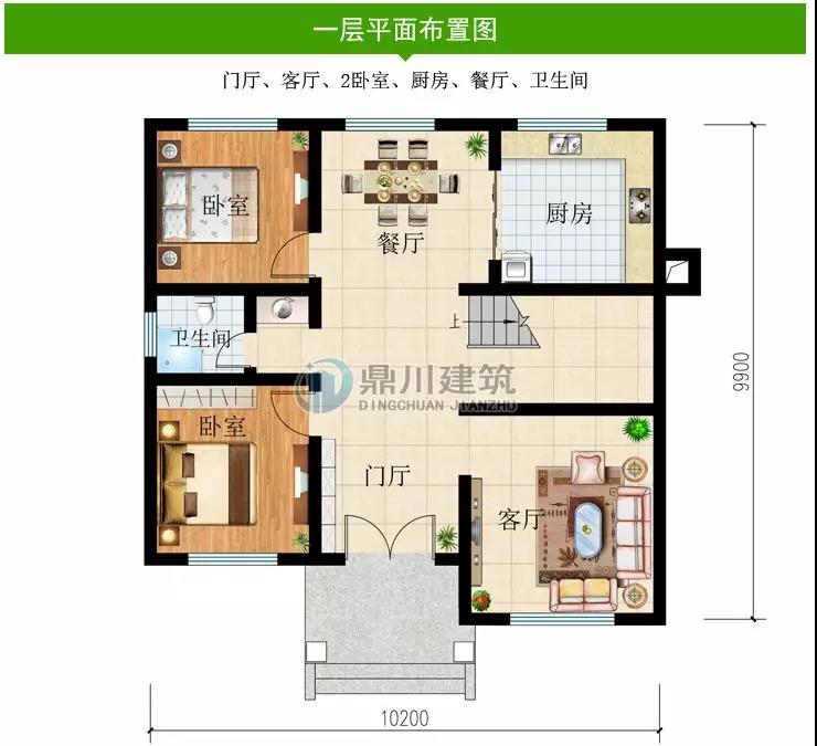 一 層:門廳、客廳、2臥室、廚房、餐廳、衛生間