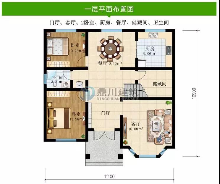一 層:門廳、客廳、2臥室、廚房、餐廳、儲藏間、衛生間