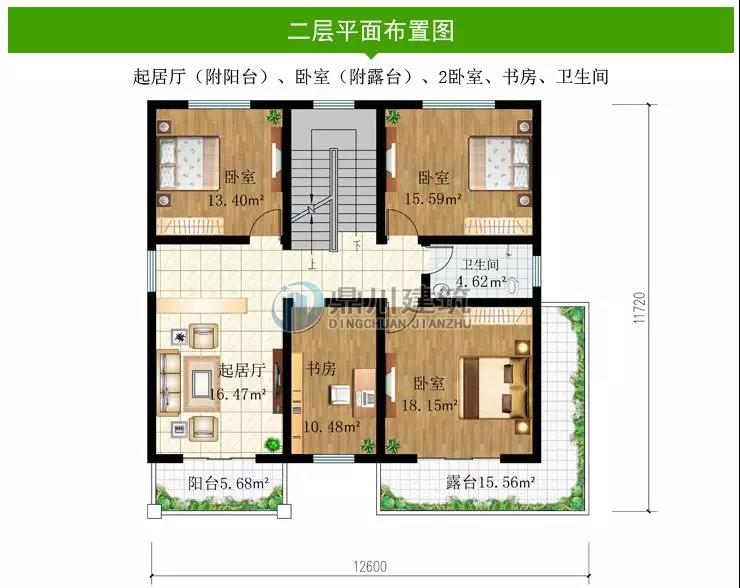 二層多臥室設計,起居廳(附陽臺)、臥室(附露臺)、2臥室、書房、衛生間。二樓設有起居廳,起居廳連接著陽臺,可以賞景,還能種植一些綠色植物,美化房子。本層共設有三個臥室,一間主臥和兩間次臥,主臥能通向室外細長的露臺,這個細長的露臺環繞大半個房間,如果種植一些花草圍繞著房子,一定會很美。