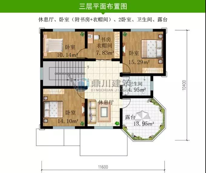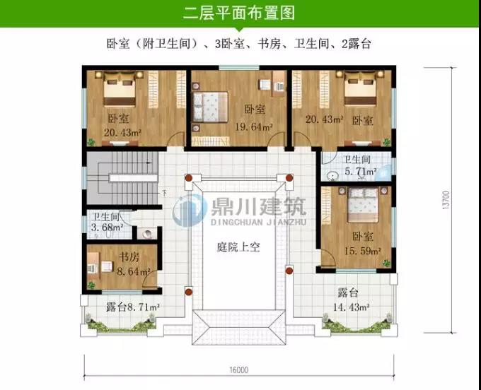 二層設有三間臥室,一個起居室,一個書房,為主要休息和工作的區域,此款戶型實用型高,很適合農村建!