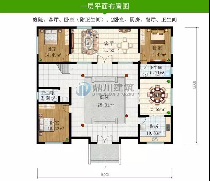 這款三合院設計用地緊湊,布局合理,簡單又實用。進門即為內庭院,正對面即為客廳,客廳占地31平,大氣寬敞。