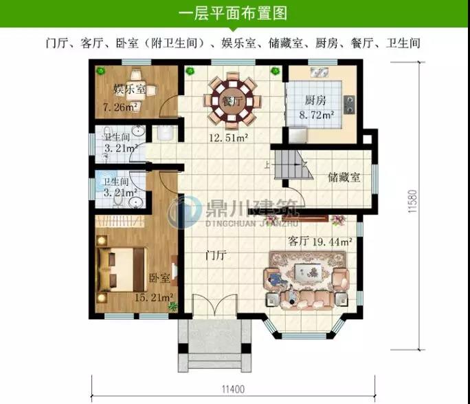 一 層: 門廳、客廳、臥室(附衛生間)、娛樂室、儲藏室、廚房、餐廳、衛生間