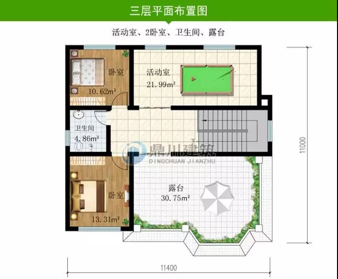 三 層: 活動室、2臥室、衛生間、露臺