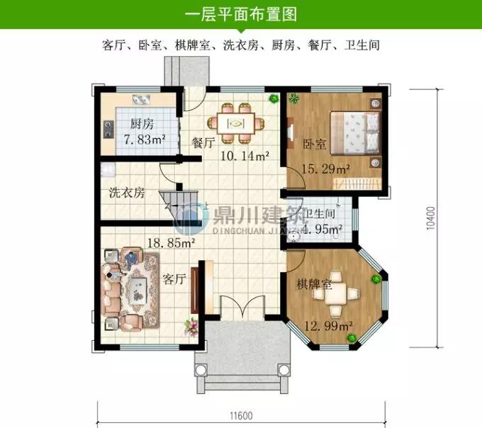 一 層設有客廳、臥室、棋牌室、洗衣房、廚房、餐廳、衛生間 ,從入戶的布局來看,通風很好,餐廳設有后門,對農村廚房來說很方便。
