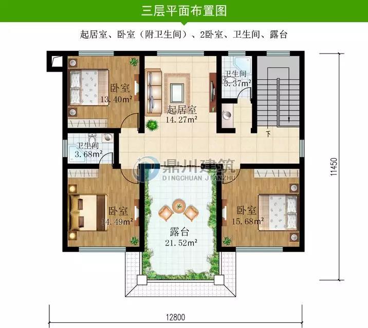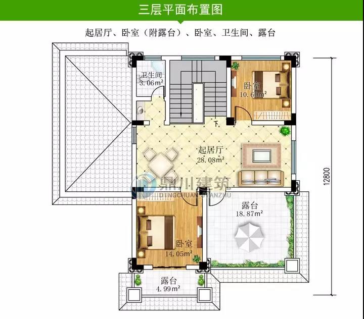 三 層: 起居室、臥室(附衛(wèi)生間)、2臥室、衛(wèi)生間、露臺(tái)