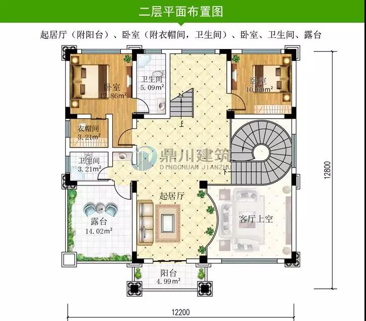 二 層: 起居廳(附陽(yáng)臺(tái))、臥室(附衣帽間,衛(wèi)生間)、臥室、衛(wèi)生間、露臺(tái)