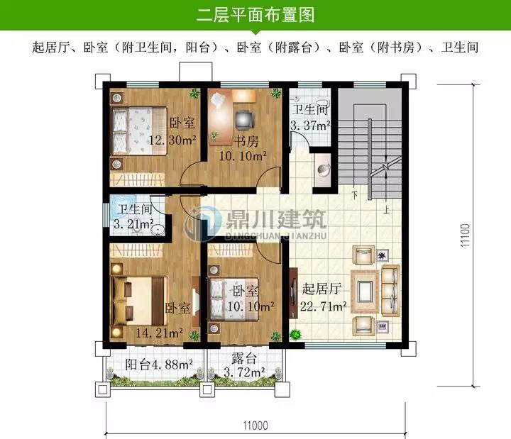 二 層: 起居廳、臥室(附衛(wèi)生間,陽(yáng)臺(tái))、臥室(附露臺(tái))、臥室(附書(shū)房)、衛(wèi)生間