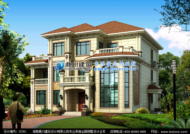 XC061歐式三層帶露臺別墅設(shè)計圖紙外觀效果圖,鼎川建筑三層別墅私人定制設(shè)計