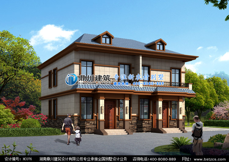 HC076農村二層雙拼小別墅設計圖紙效果圖,鼎川建筑雙拼自建房設計圖外觀效果圖