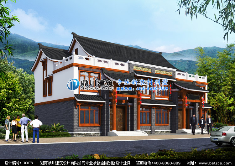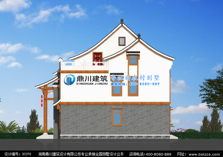 XC078農村二層半雙拼中式別墅設計圖效果圖,鼎川建筑中式雙拼別墅定制設計