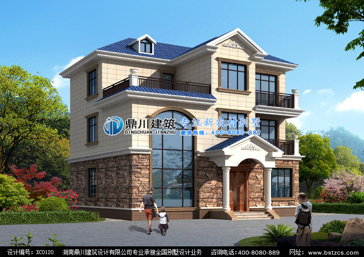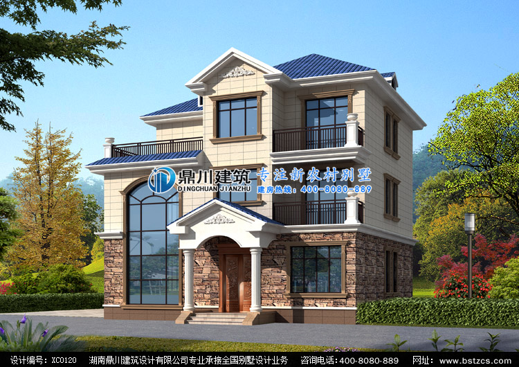 XC0120三層帶露臺農村自建別墅圖紙外觀效果圖,鼎川建筑三層別墅私人定制設計