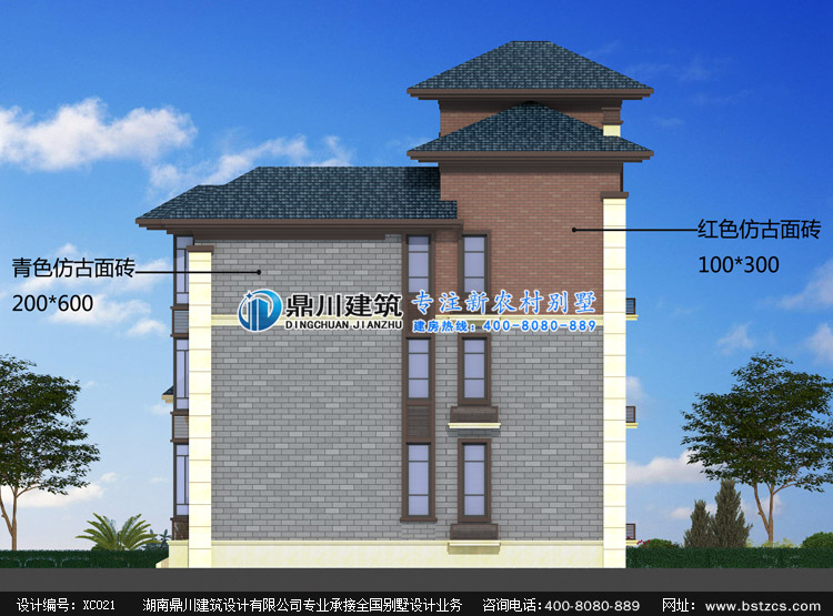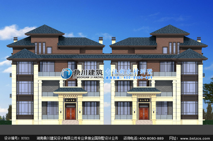 XC021三層半中式雙拼別墅設計圖紙外觀效果圖,鼎川建筑三層中式雙拼別墅設計