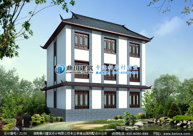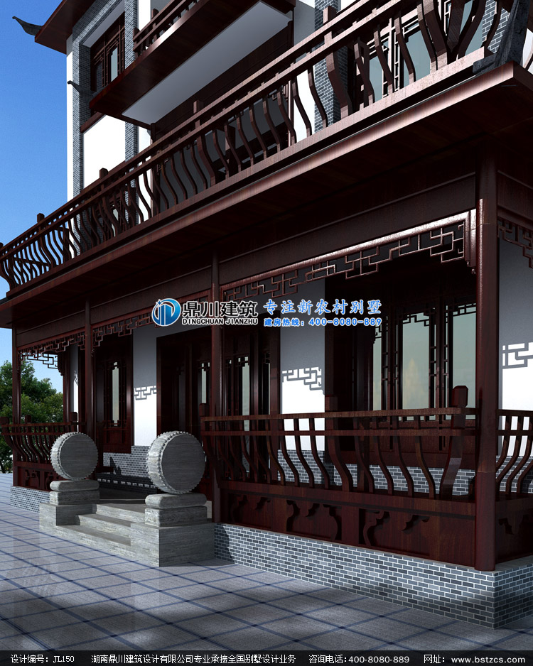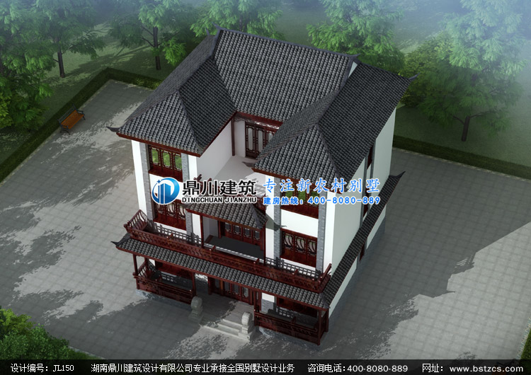 JL150三層帶露臺中式別墅私人定制設計圖外觀效果圖,三層中式別墅設計圖紙