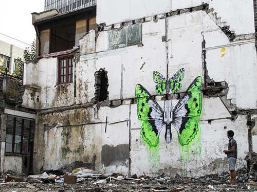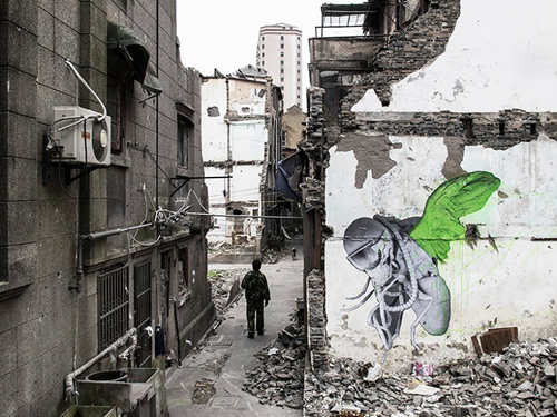 ludo在建筑廢墟上繪制了一系列藝術繪畫,讓他的藝術和中國文化進行了面對面的交流。他的畫將植物和動物帶入了21世紀的城市,與城市形成了互補的有機體,既優雅又激烈。他在畫中運用了他標志性的綠色,將自然、科技、美學和暴力融為一體,在破舊的籬笆上、破敗的墻上以及建筑外墻上都留下了一些大型作品。藝術家短暫的作品以照片的形式記錄下了中國社會正在發生的快速轉變,傳達出了重生、希望和敬畏之意。