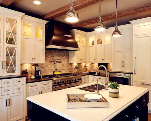 選擇使用多門組合方式,它可以非常人性化的為廚房進行海量收納。這個廚房多采用嵌入式設計的家具,一體式多門組合櫥柜和嵌入式的烤箱和洗碗機,加上合理的功能區域布置,使整個廚房井然有序,實用性強大。