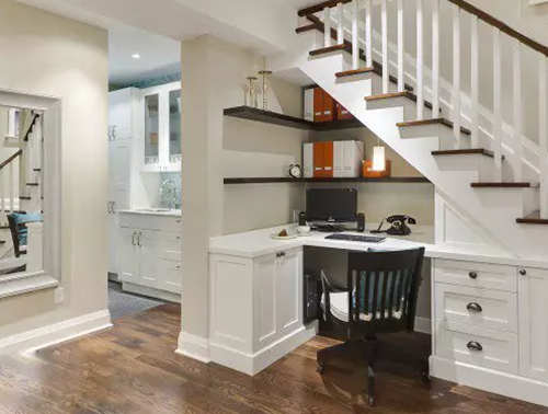 樓梯下方的空間根據各個家庭不同的設計而有大有小,如果太小就不是很好利用,下這樣將其下方設計成一個小小的工作室也許會是個不錯的想法。但是一定能要保證樓梯的高度夠高,要不就該撞到頭了。
