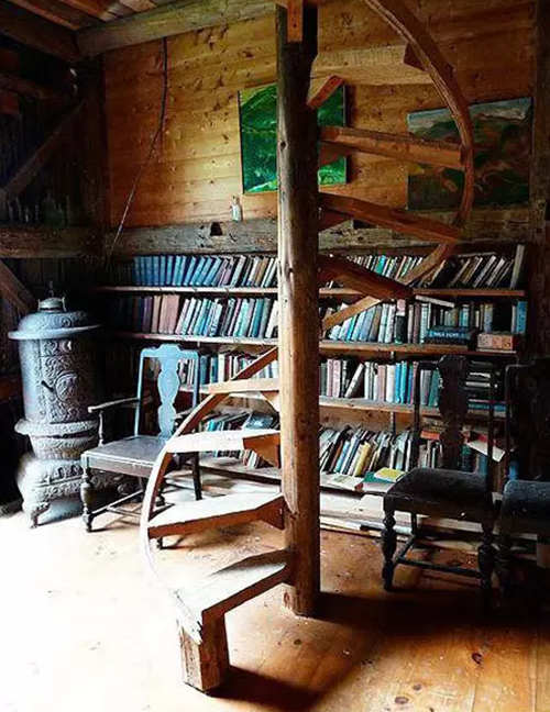 木質的旋轉樓梯以及木質的書架和地板都讓整個空間充滿淡淡的寧靜感。加上墻面上滿滿的書籍讓整個身心都瞬間沉靜下來。旋轉樓梯下方的空間可以設計成各種各樣的,不必拘泥于書房這樣的設計。