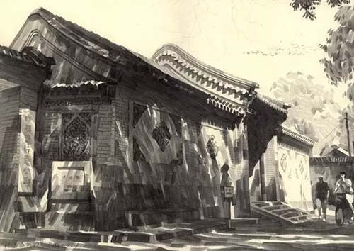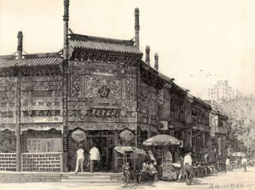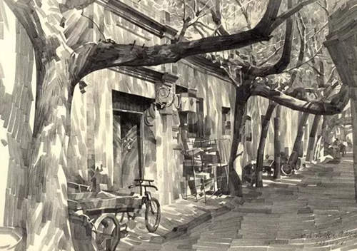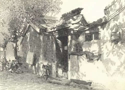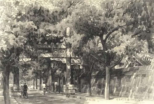 他選用寬線條鉛筆特有的筆觸來表現歷史的遺存,從他筆下的門樓、房舍、街景等日常景物中你會發現平凡生活的詩意、濃得化不開的人情味,還會體會到濃厚的歷史文化感。