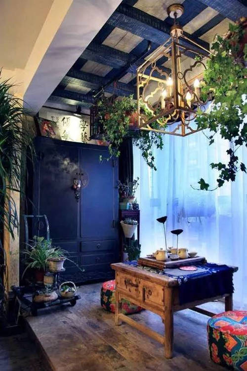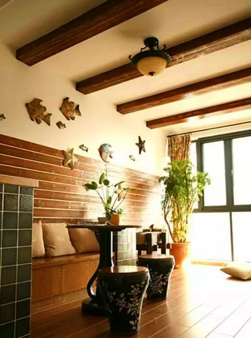 利用井字梁或者為了頂面造型制作假格梁的一種吊頂形式,幾何感強(qiáng)烈,充滿張力。由于采用木質(zhì)材料,散發(fā)粗糙原始的氣質(zhì),自然舒適。