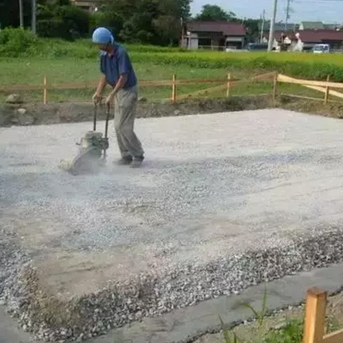 ▼在基礎下部澆注素混凝土條形墊層后,回填碎石墊層,并進行壓實整平處理。