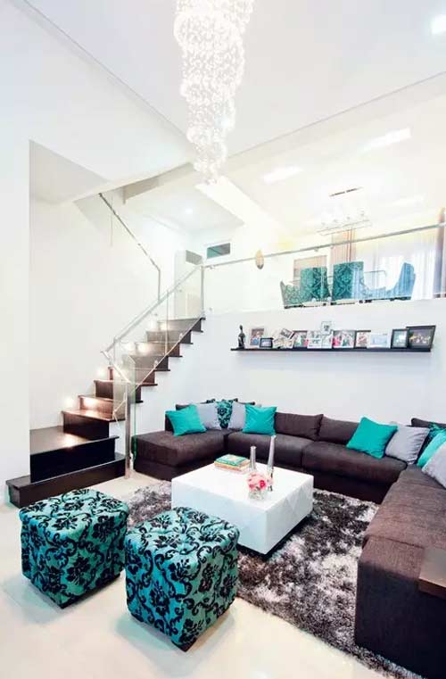 復式戶型的吊頂這樣設計倒是不錯滴!不用大的吊燈,而是像這樣高低組合、形態各異的搭配很吸睛。