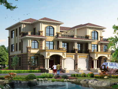 S049漂亮的三層帶車庫雙拼別墅外觀效果圖,鼎川建筑雙拼別墅