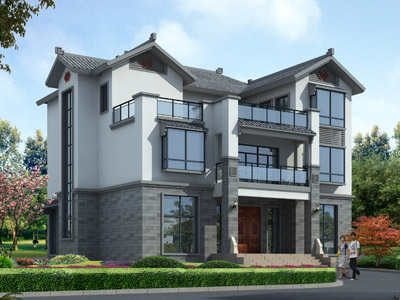 E047新中式三層帶露臺小別墅設計圖,中式別墅設計外觀圖