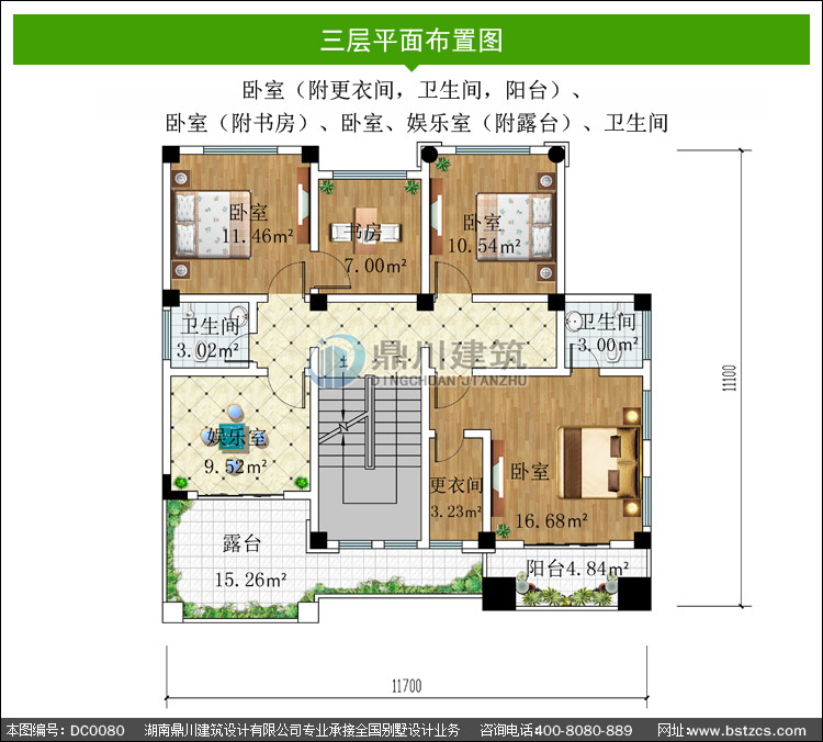| 三 層: | 臥室(附更衣間,衛生間,陽臺)、臥室(附書房)、臥室、娛樂室(附露臺)、衛生間 | |||