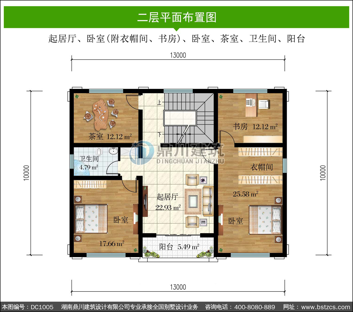 | 二 層: | 起居廳、臥室(附衣帽間、書房)、臥室、茶室、衛生間、陽臺 | |||