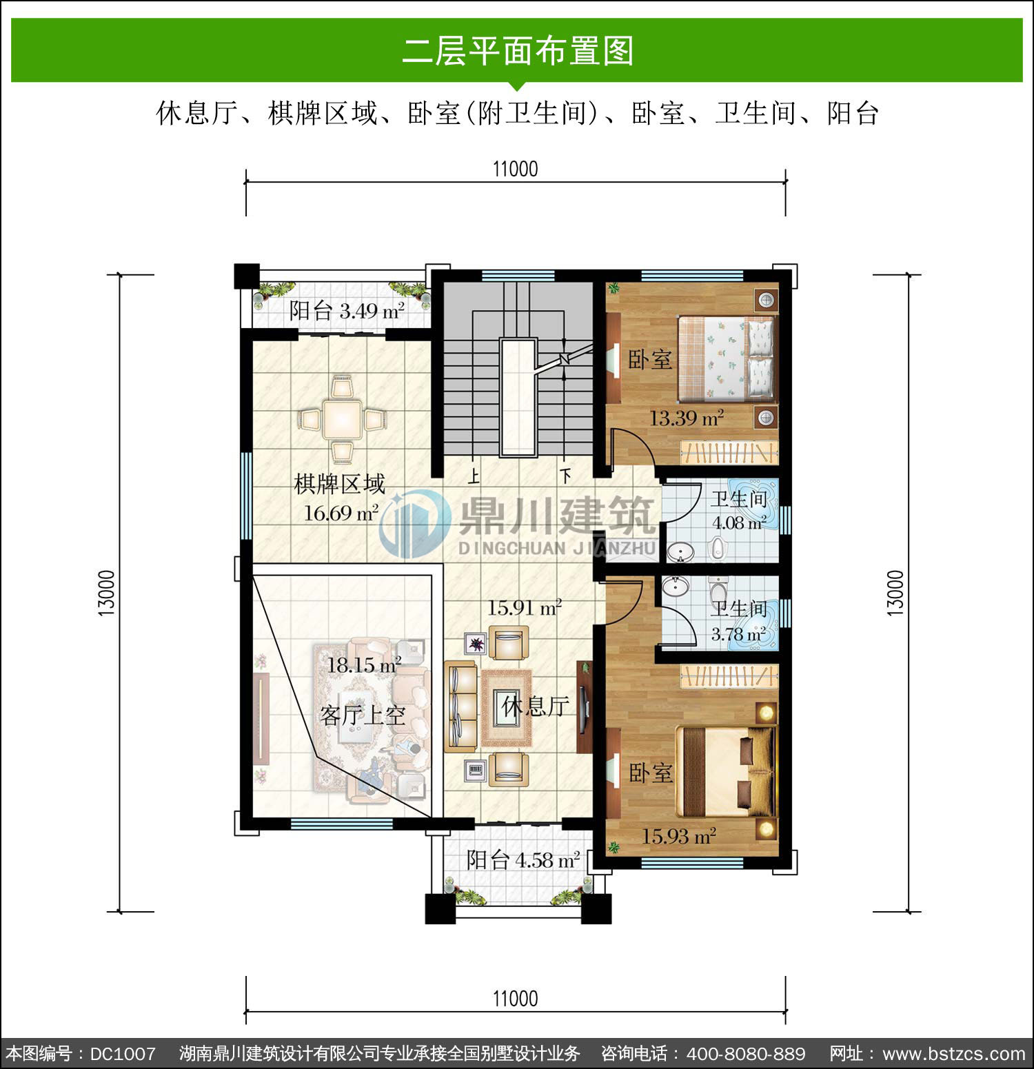 | 二 層: | 休息廳、棋牌區(qū)域、臥室(附衛(wèi)生間)、臥室、衛(wèi)生間、陽臺(tái) | |||