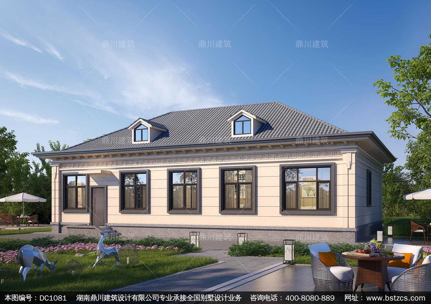 新中式一層別墅施工圖紙及外觀效果圖_農村自建別墅設計,鼎川建筑