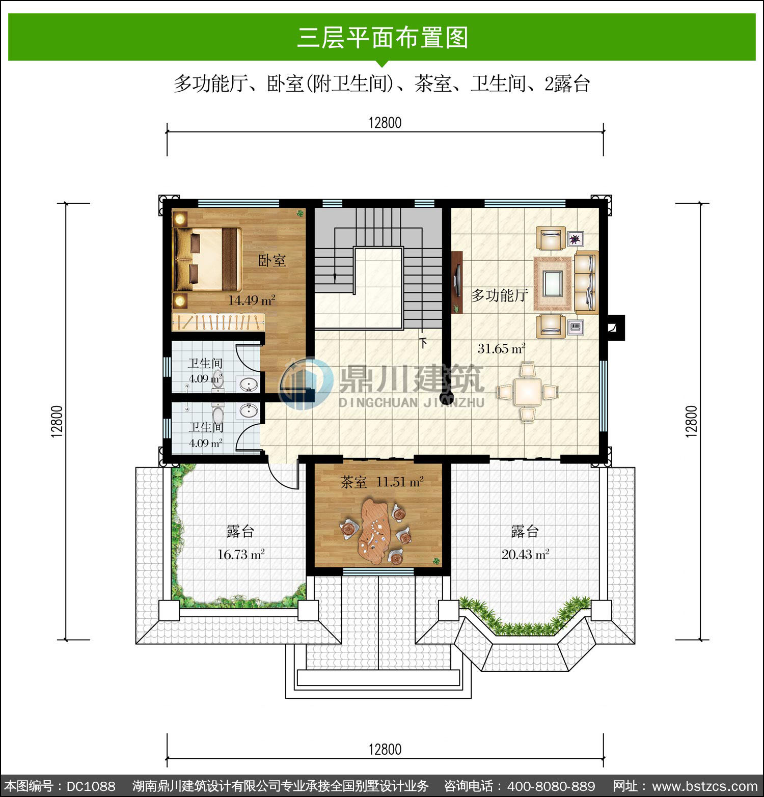 | 三 層: | 多功能廳、臥室(附衛(wèi)生間)、茶室、衛(wèi)生間、2露臺(tái) | |||