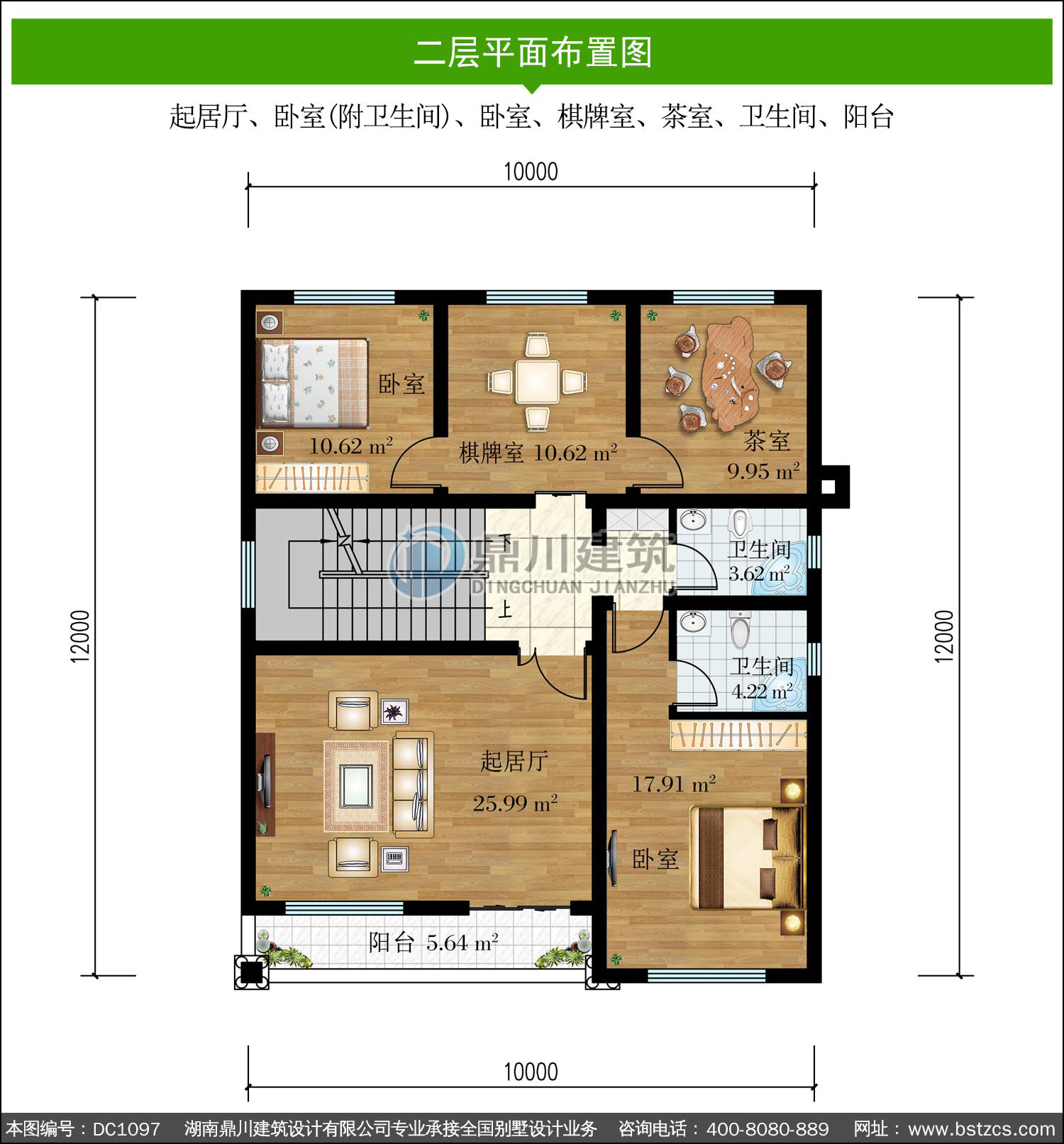 | 二 層: | 起居廳、臥室(附衛(wèi)生間)、臥室、棋牌室、茶室、衛(wèi)生間、陽臺 | |||