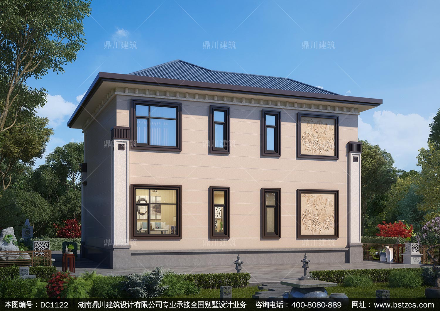 新中式二層復式別墅效果圖及施工圖紙_農村自建別墅設計,鼎川建